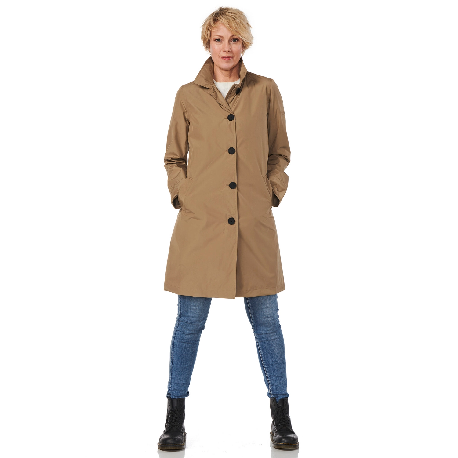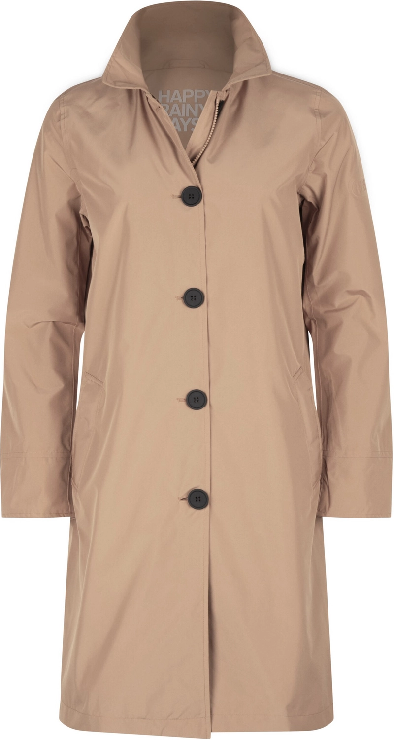 Deze elegante regenjas is afkomstig van de Bilbao serie van het merk Happy Rainy Days. De jas is gemaakt van 100% gerecycled polyester, waardoor de jas zeer duurzaam is. Daarnaast is de jas voorzien van getapete naden waardoor de jas volledig waterdicht is. Verder is de jas winddicht en zeer goed ademend. U bent dus goed beschermd tegen de elementen met deze jas. De regenjas is voorzien van een voorsluiting met rits en knopen en is bovendien voorzien van praktische steekzakken met ritssluiting. De pasvorm van de jas is regular fit en de jas valt zo ongeveer tot op de knie.
