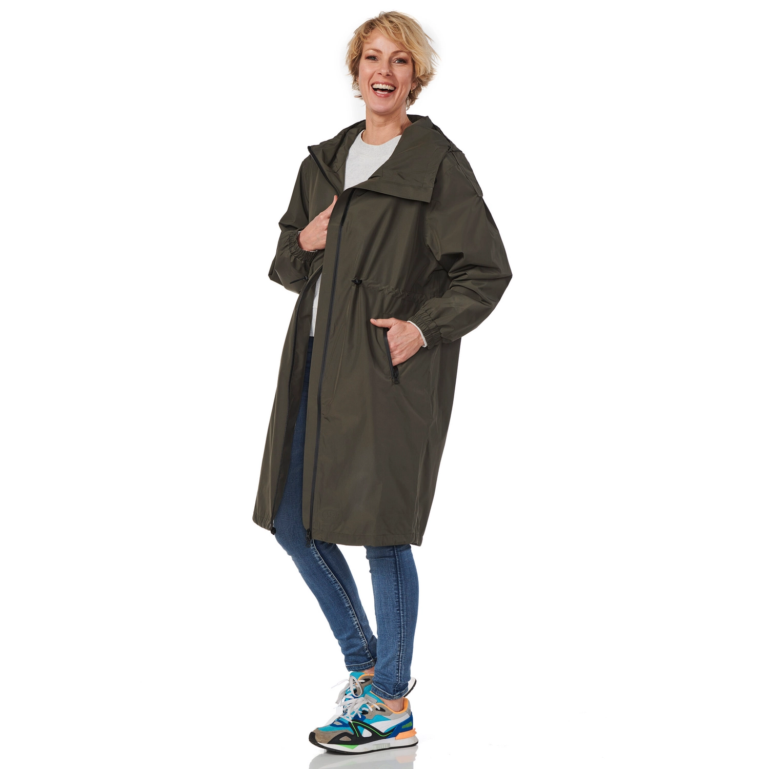 Deze modieuze regenjas is afkomstig van de Manhattan serie van het merk Happy Rainy Days. De jas is uitgevoerd in het model van een wijdvallende parka coat wat voor een stijlvolle uitstraling zorgt. De regenjas is gemaakt van 100% gerecycled polyester en is volledig waterdicht dankzij de getapete naden. Daarnaast is de jas winddicht en zeer goed ademend, waardoor u er ook bij slecht weer comfortabel bij loopt. Verder heeft de jassen zakken met een waterdichte gecoate ritssluiting en een waterdichte gecoate ritssluiting aan de voorkant. Ook is de jas voorzien van een fijne capuchon. Bovendien heeft deze regenjas een ruime fit pasvorm tot over de knie en is de jas voorzien van een elastiek in de taille en onderkant, waarmee u de jas modieus kunt tailleren.