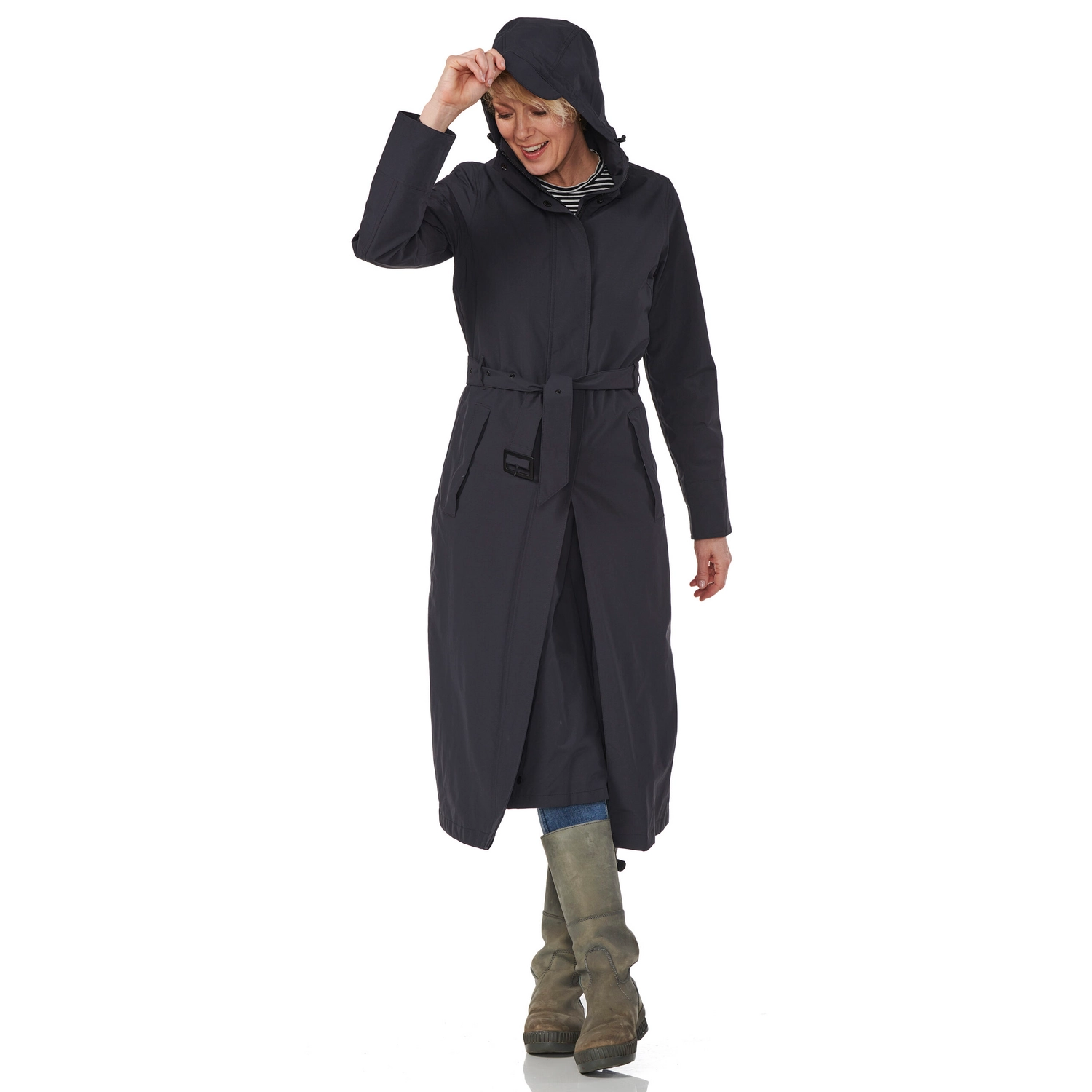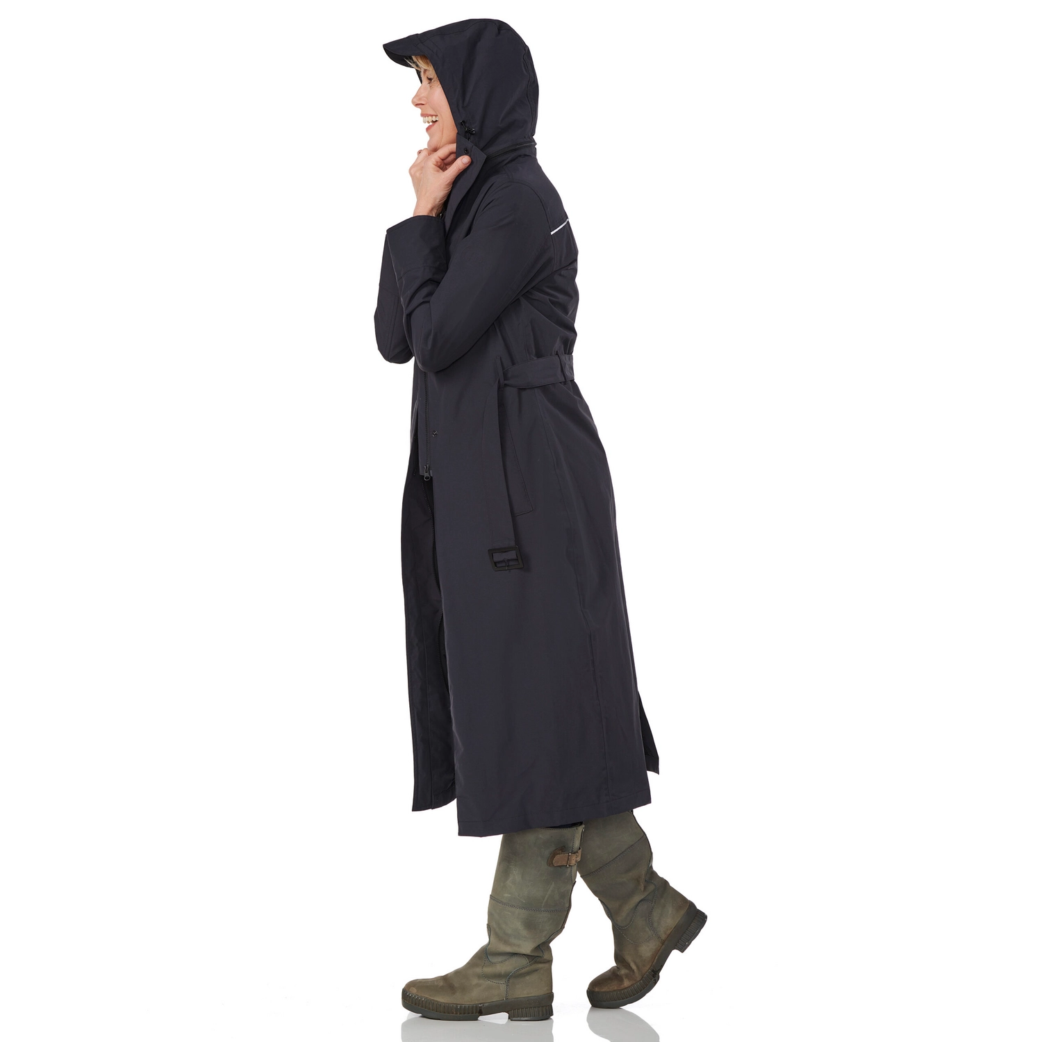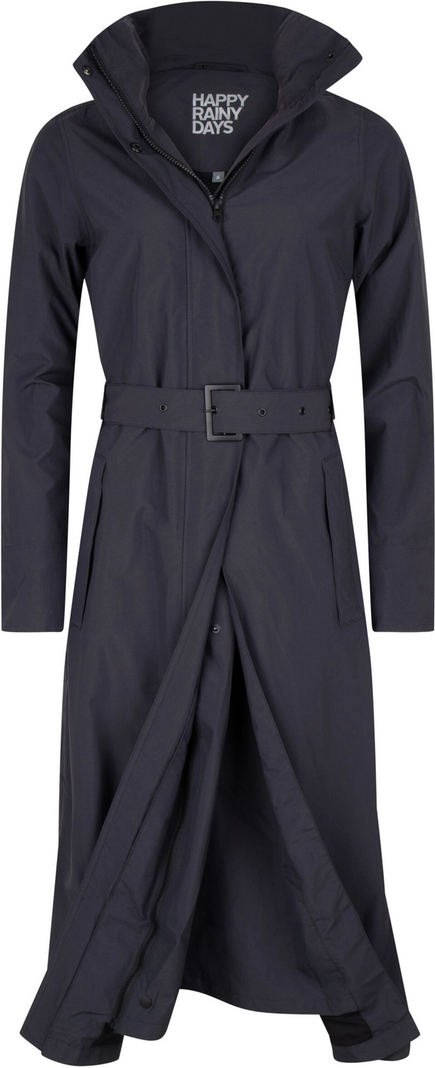 Deze super comfortabele regenjas is afkomstig van de Montreal serie van het merk Happy Rainy Days. Deze regenjas rijkt tot de enkels en heeft een stijlvolle silhouet. De jas is gemaakt van gecoat nylon. Hierdoor is de jas waterdicht, winddicht en zeer goed ademend. Daarnaast is de jas voorzien van een afneembare capuchon die op te rollen is in de kraag, waardoor u comfortabel de regenbuien kunt trotseren. Deze regenjas is voorzien van tussenstuk speciaal voor op de fiets. Door de flap die naar binnen geritst kan worden, heeft u extra bewegingsruimte en blijven uw benen droog tijdens het fietsen of wandelen. Verder is de jas voorzien van een ritssluiting met drukknopen en hebben de zakken een ritssluiting. Bovendien heeft de jas een ceintuur met gesp, waardoor u de jas vrouwelijk kan tailleren. De Montreal regenjas is een echte musthave voor het najaar en de winter!
