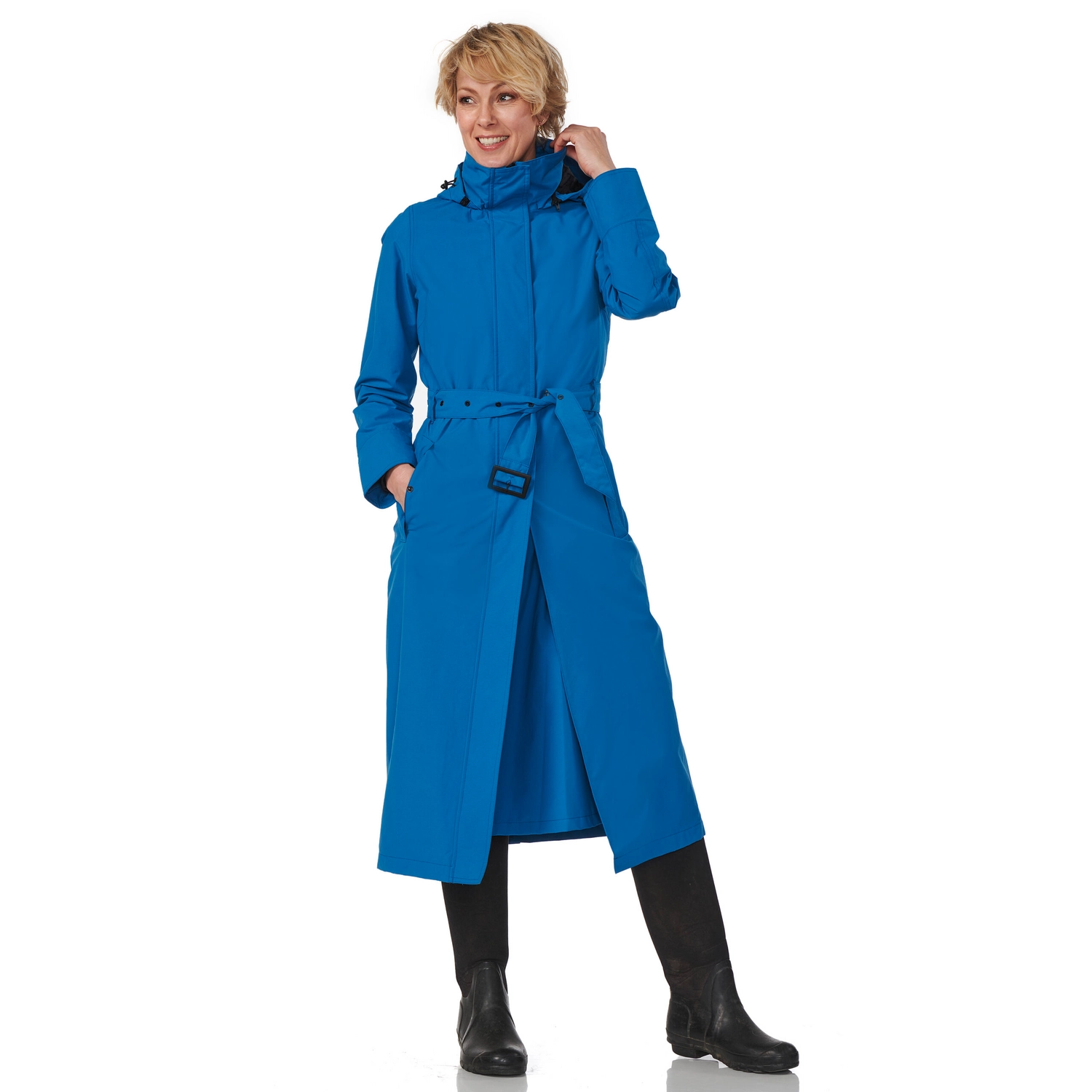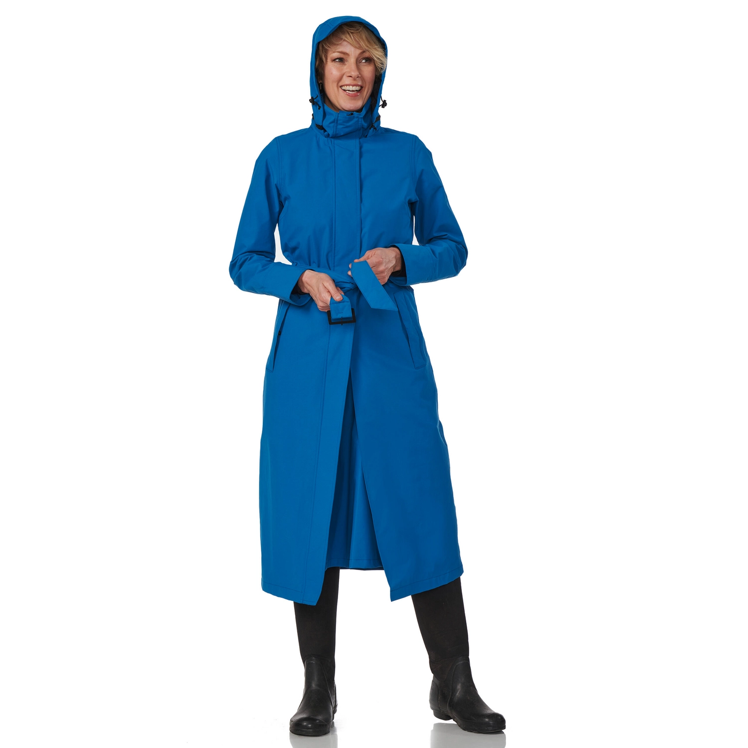 Deze super comfortabele regenjas is afkomstig van de Montreal serie van het merk Happy Rainy Days. Deze regenjas rijkt tot de enkels en heeft een stijlvolle silhouet. De jas is gemaakt van gecoat nylon. Hierdoor is de jas waterdicht, winddicht en zeer goed ademend. Daarnaast is de jas voorzien van een afneembare capuchon die op te rollen is in de kraag, waardoor u comfortabel de regenbuien kunt trotseren. Deze regenjas is voorzien van tussenstuk speciaal voor op de fiets. Door de flap die naar binnen geritst kan worden, heeft u extra bewegingsruimte en blijven uw benen droog tijdens het fietsen of wandelen. Verder is de jas voorzien van een ritssluiting met drukknopen en hebben de zakken een ritssluiting. Bovendien heeft de jas een ceintuur met gesp, waardoor u de jas vrouwelijk kan tailleren. De Montreal regenjas is een echte musthave voor het najaar en de winter!
