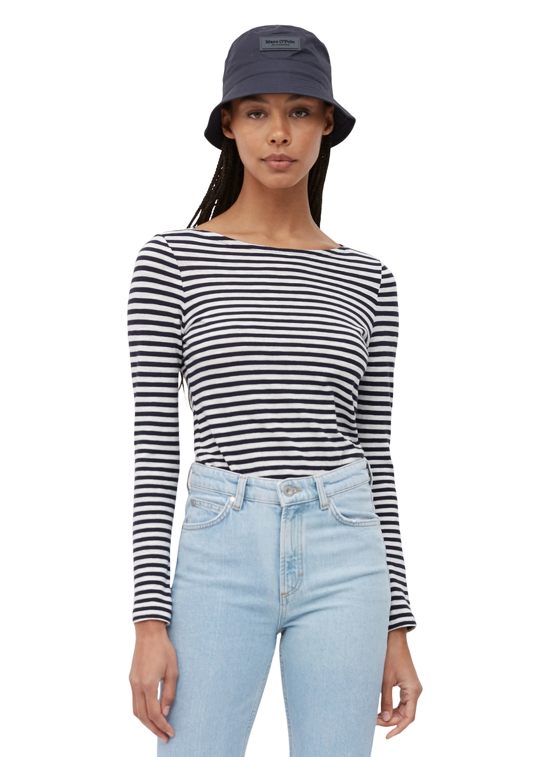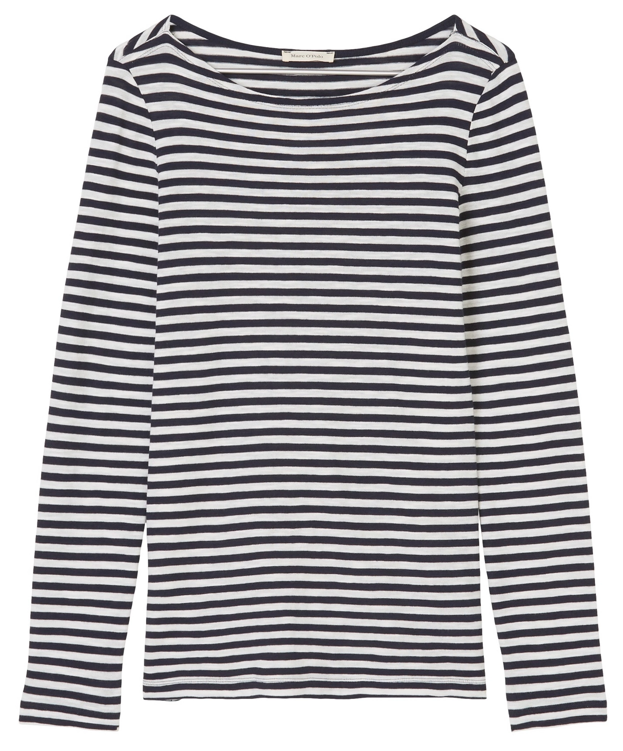 Dit t-shirt is van het merk Marc O’Polo. Het t-shirt is vervaardigd uit 100% GOTS gecertificeerd, hoogwaardig en zuiver katoen slub jersey. Hierdoor voelt het t-shirt zowel zacht en licht korrelig aan. Het t-shirt bevat lange mouwen en een vrouwelijke boothals. Het t-shirt heeft een klassiek design van strepen. Shop dit t-shirt voor een leuke casual look.